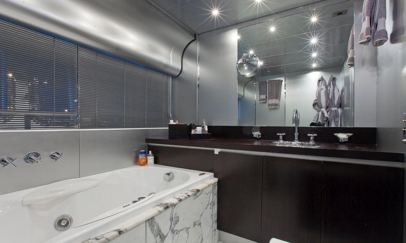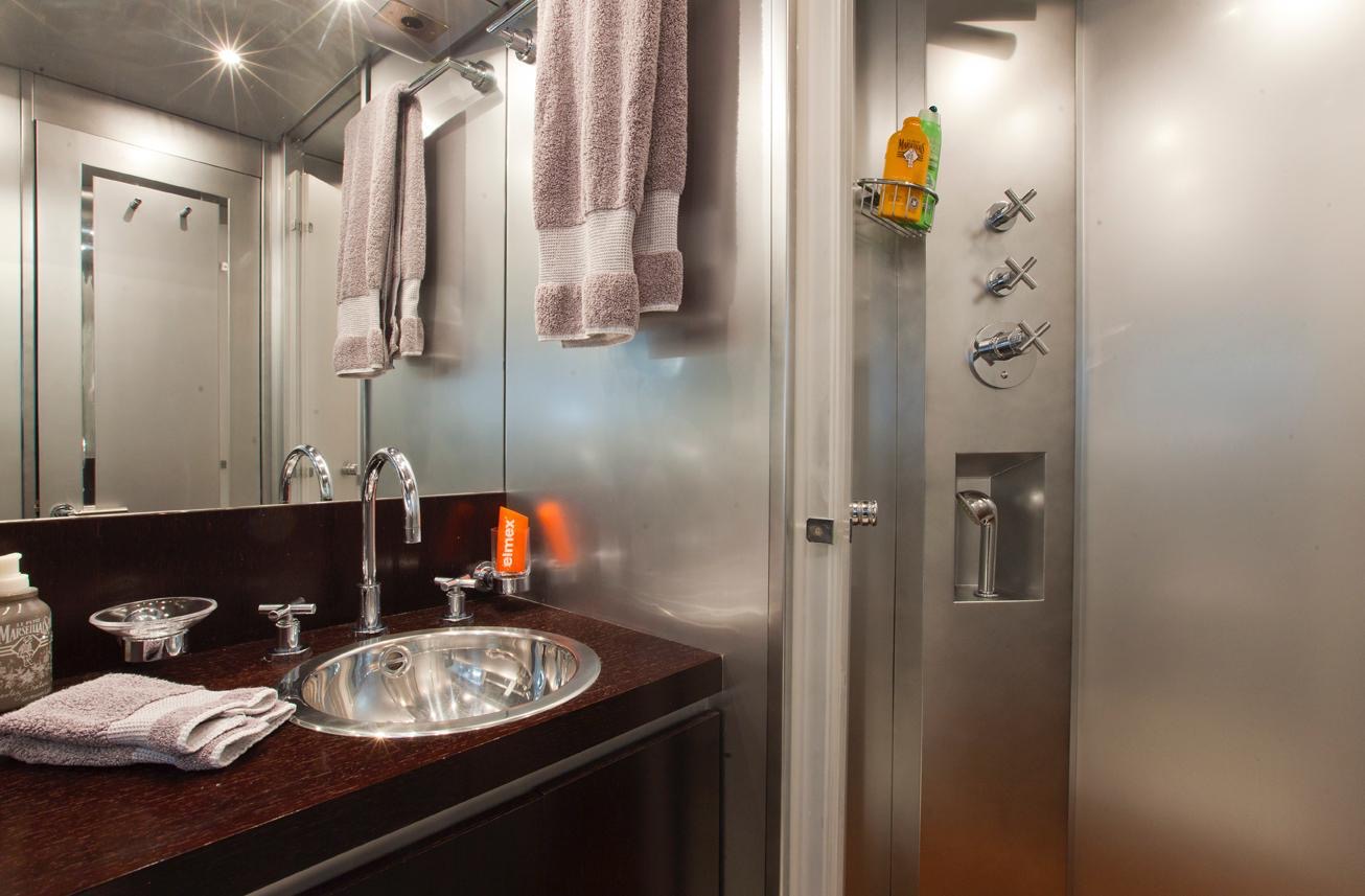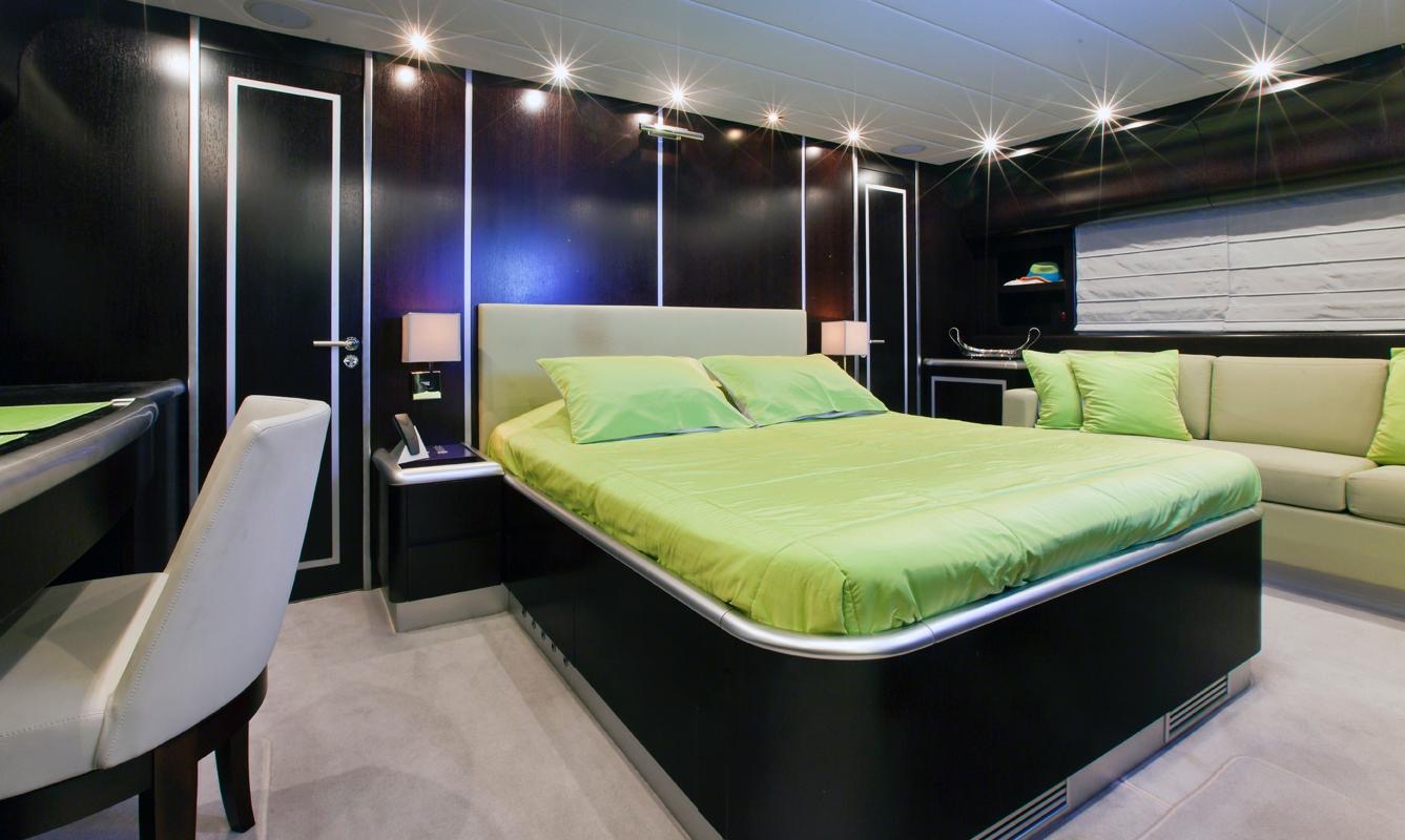 La spaziosa cabina armatoriale a tutto baglio, simile ad una suite di Superyacht, è incredibilmente raffinata e spaziosa, dotata di un comodo letto matrimoniale e di un sontuoso bagno privato.